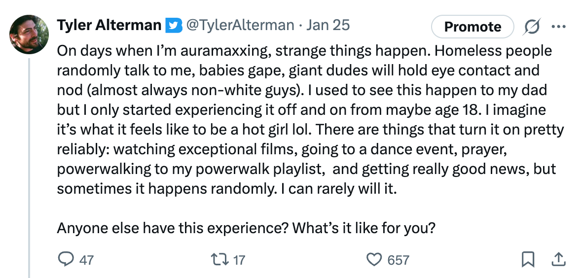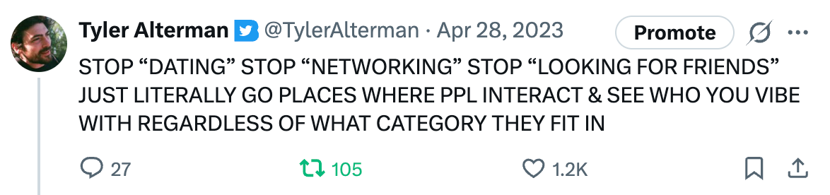 It’s obvious how to play the approach role. The basics are that you just go up to someone and say hey. You don’t need a pickup line; you just need a vibe of genuine curiosity about the other person.2 The old infrastructure for approaching has somewhat disintegrated. It’s become harder to meet people at, eg, bars. Instead, I recommend:
