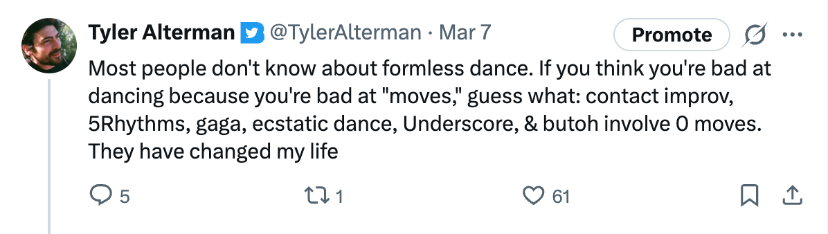 Actually I do have advice: if you like to dance or think you could become someone who does, social dancing makes the whole thing much easier. You get a low stakes wait to train playing-your-role across many iterations. Moreover, there are few better ways to test out chemistry than dancing. I can often tell in the first few seconds of dancing whether I’m attracted to someone, whereas I really am bad at this with the apps.